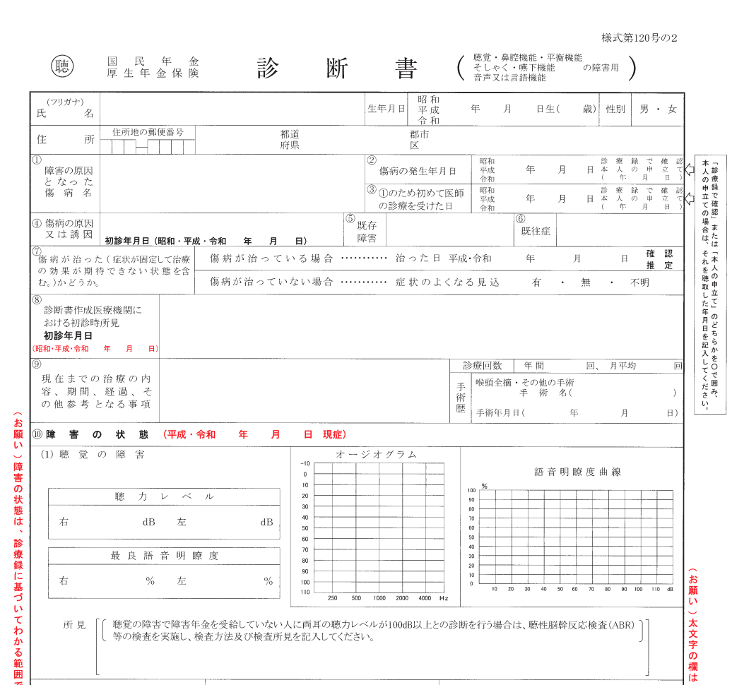 感音性難聴で障害年金を請求する際に使用する診断書は「診断書(聴覚・鼻腔機能・平衡感覚・そしゃく・嚥下・言語機能の障害用)」になります。