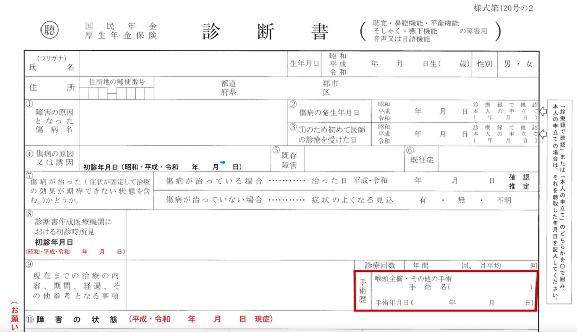 喉頭全摘出で障害年金を請求する際に使用する診断書は「診断書(聴覚・鼻腔機能・平衡感覚・そしゃく・嚥下・言語機能の障害用)」になります。