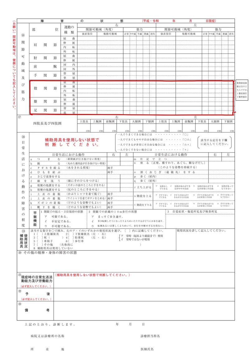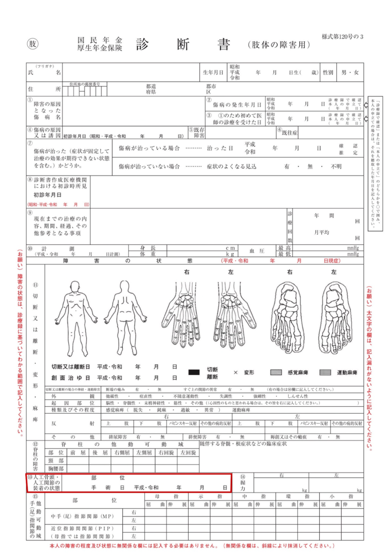 ⑬人工関節の装着の状態に「手術部位」と「手術日」の記載漏れがないか確認します。障害の程度2級以上に該当する場合は、⑯関節可動域及び筋力の記載が必ず必要になります。
